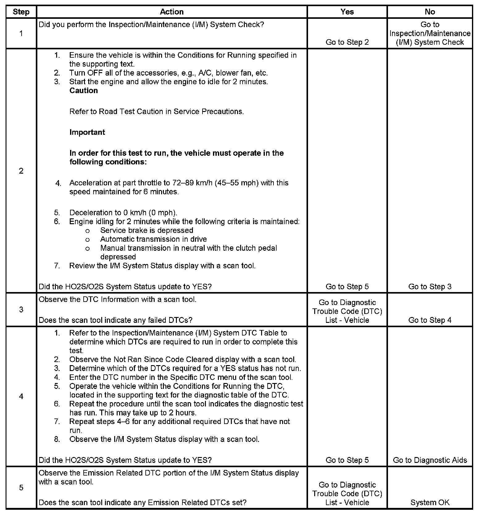 The purpose of this test is to satisfy the enable criteria necessary to execute inspection and maintenance (I/M) readiness diagnostics for the oxygen sensor/heated oxygen sensor (O2S/HO2S) system. The test may be used to set the I/M System Status to YES. The I/M System Status Display on the scan tool provides an indication of whether the control module has completed the required tests. The I/M System Status does not indicate that the tests have passed or failed. When all of the diagnostics for a specific system have run and passed the I/M System Status will update to YES. If a test for a specific system has failed, the I/M System Status will update to YES, indicating a determination was made, even if all of the other tests for that system have not run.