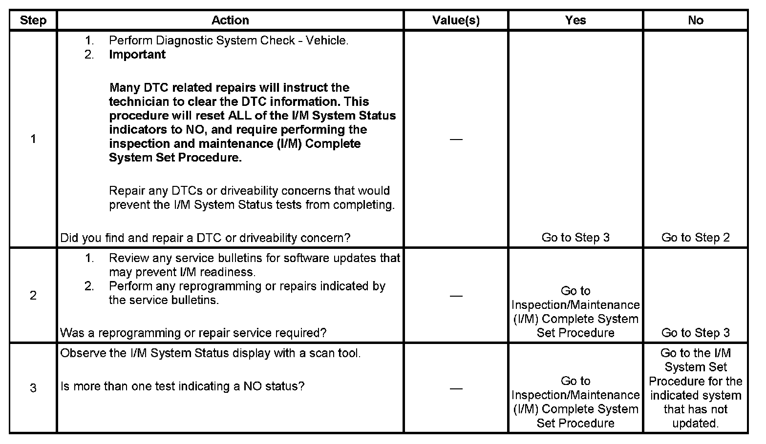 For the specific DTCs required for each system, refer to Inspection/Maintenance (I/M) System DTC Table. Systems such as fuel delivery, misfire, and comprehensive components may not be listed in a system status list. These tests run continuously and do not require an I/M System Status indicator. System DTC Table