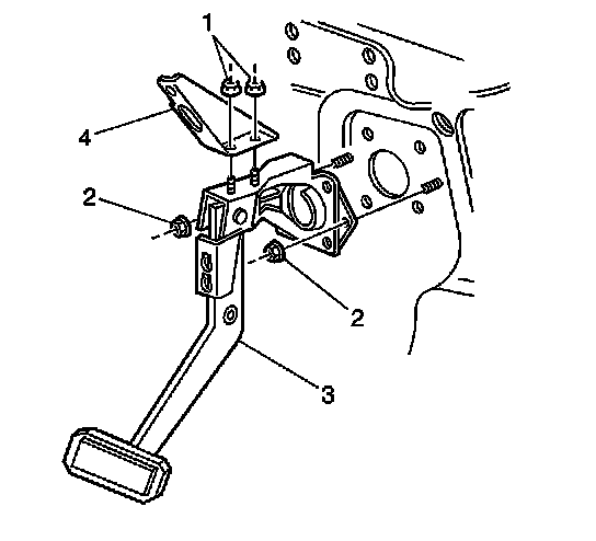 10. Remove the brake pedal brace (4) mounting nuts (1).