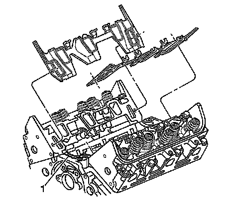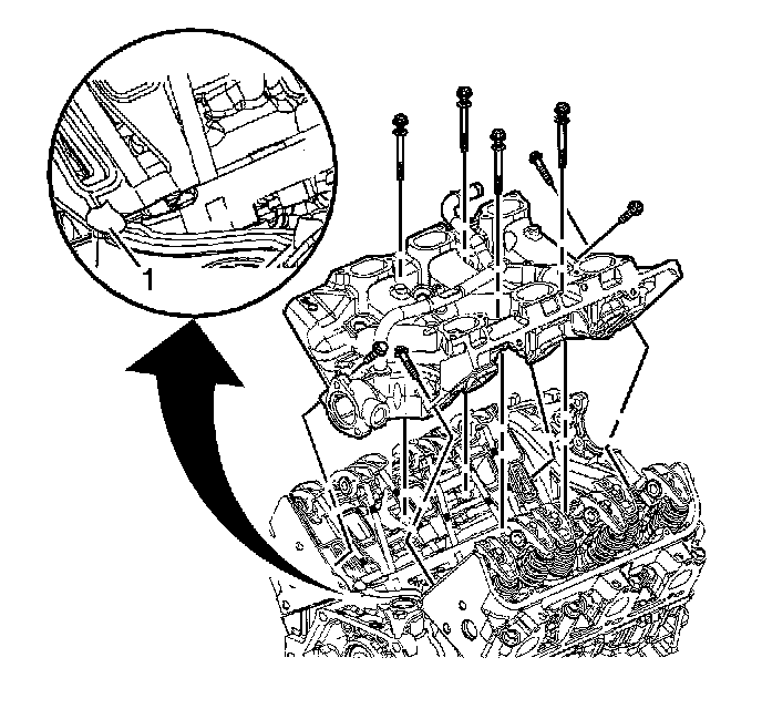 3. With gaskets and seals in place apply a small drop 8 - 10 mm (0.31 - 0.39 inch) of RTV sealer GM P/N 12378521 (Canadian P/N 88901148), or equivalent, to the 4 corners of the intake manifold to block joints (1).