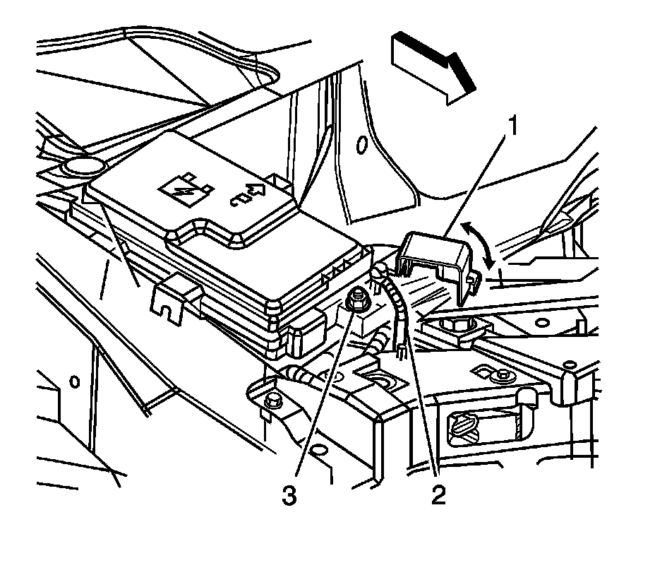 5. Install the positive battery cable (2) over the stud and install the retaining nut (3).