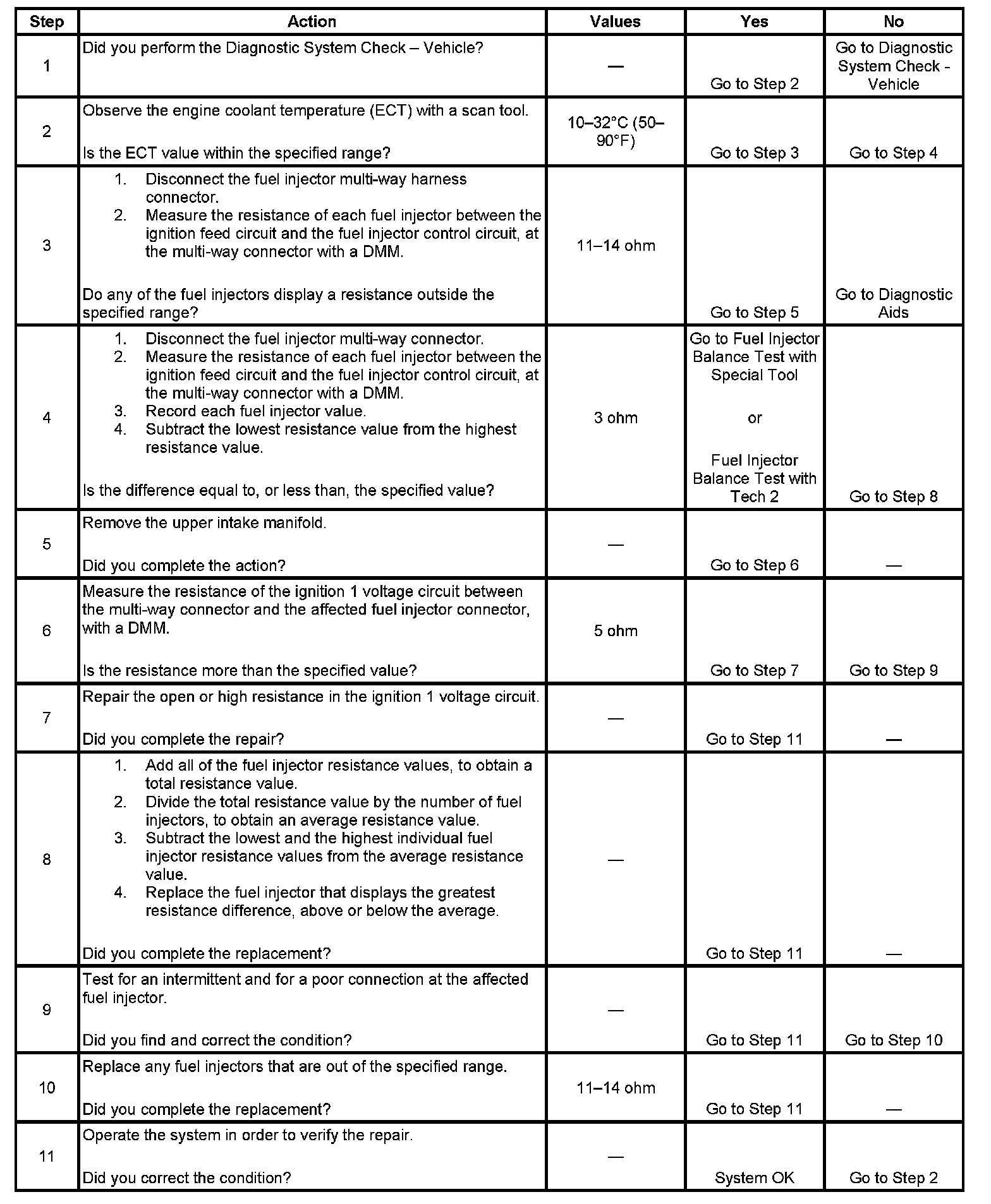 3. This step tests each fuel injector resistance within a specific temperature range. If any of the fuel injectors display a resistance outside of the specified value, replace the fuel injector.