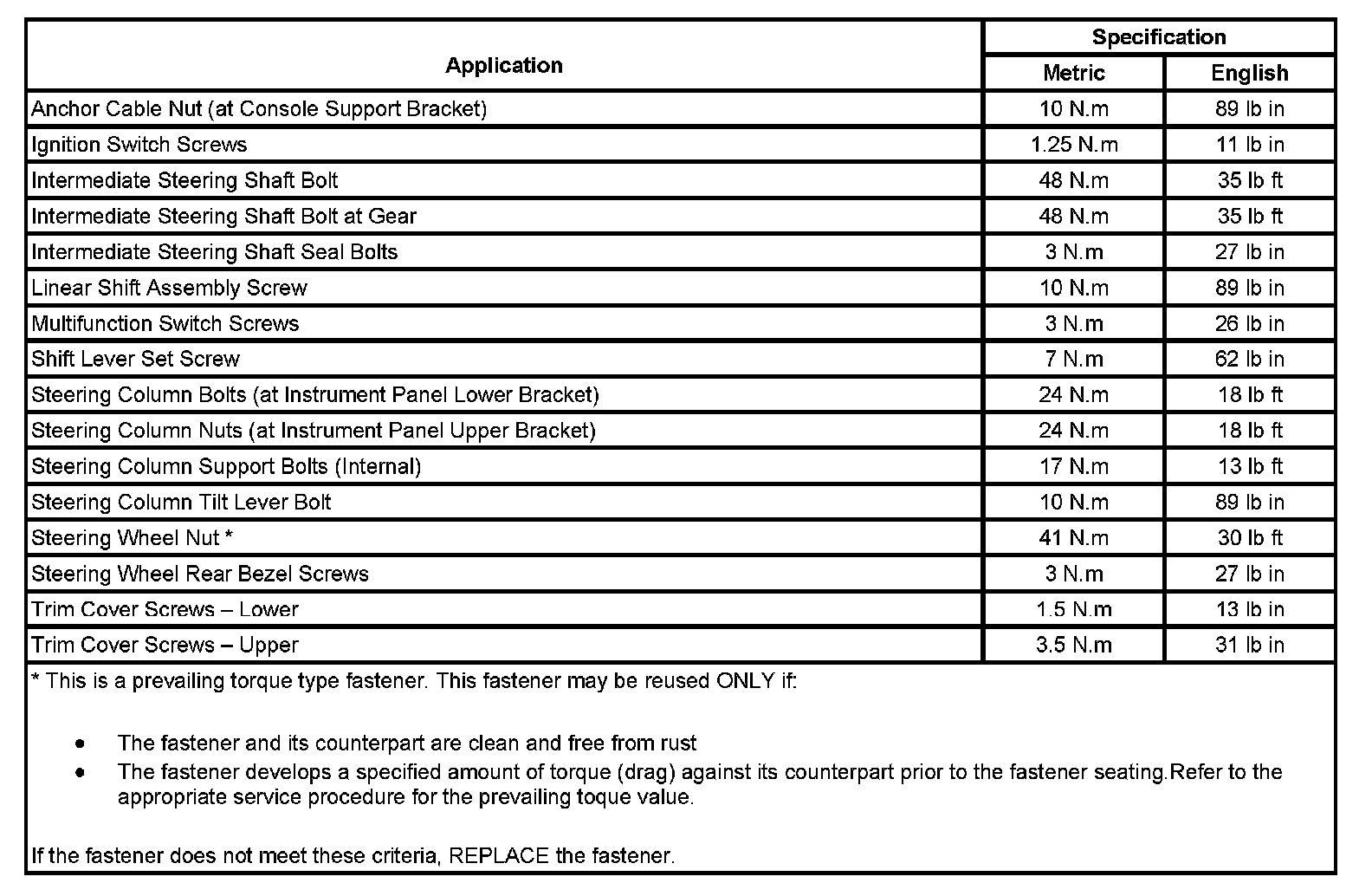 Fastener Tightening Specifications: