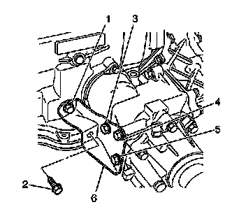 14. Remove the transfer case side brace bolts (1-5), and the transfer case side brace (6).