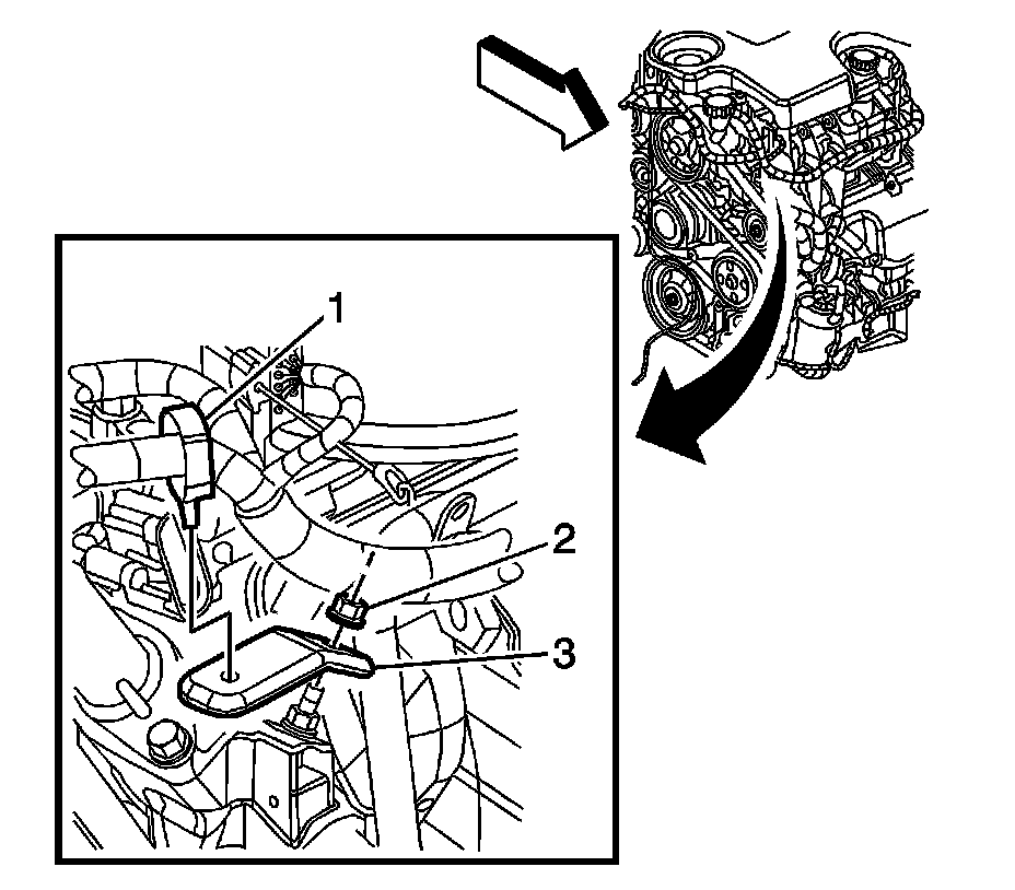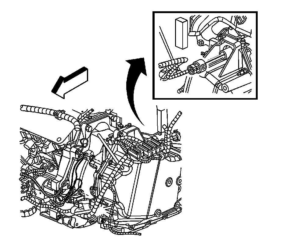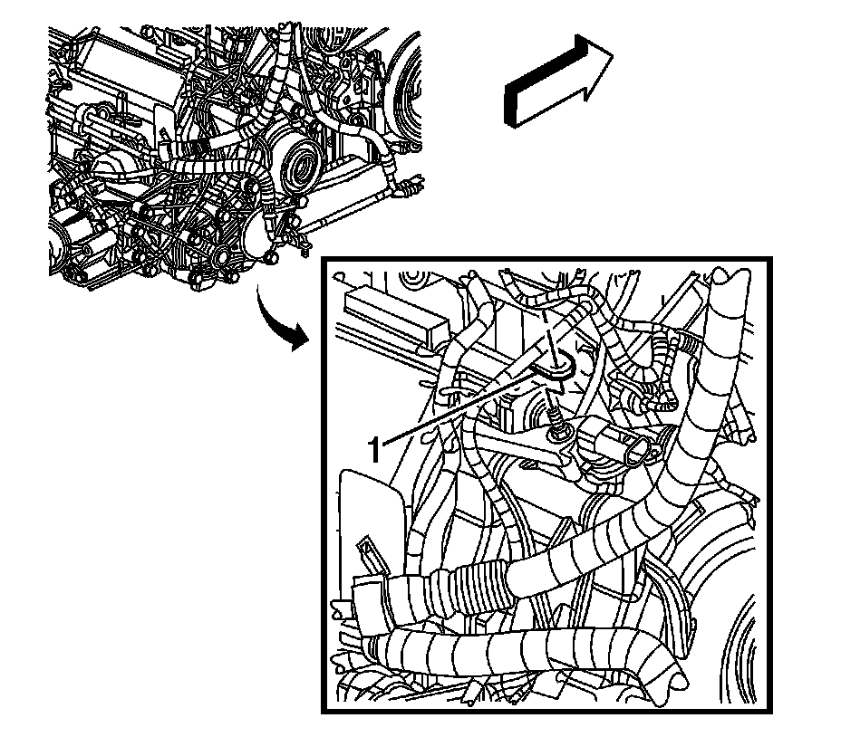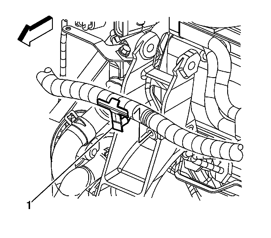 18. Install the engine harness clip (1) to the stud on the transaxle.