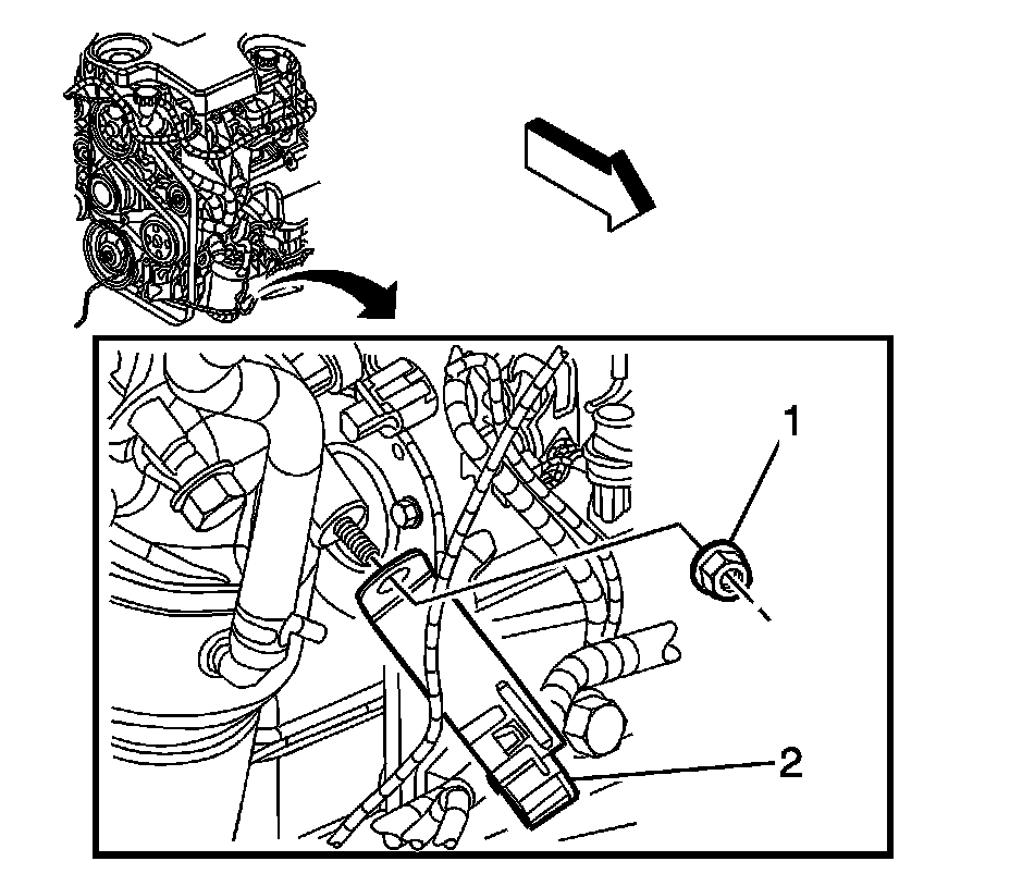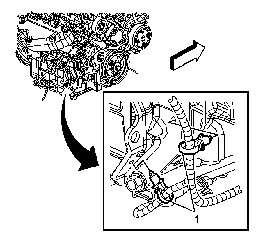 38. Install the engine harness clip (1) to the ignition coil bracket.