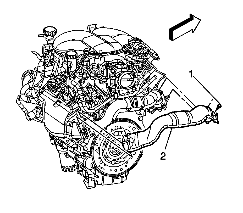 44. Install the exhaust crossover pipe (2) and nuts (1).