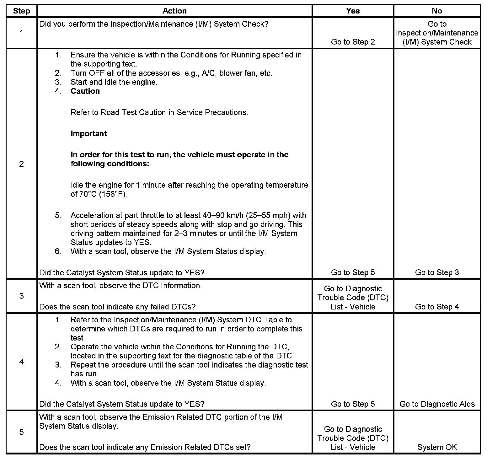 5. The I/M System Status only reports on whether or not a diagnostic has run, not what the outcome of the test was. If any Emission Related DTC sets after the tests are complete, the DTC will require diagnosis.