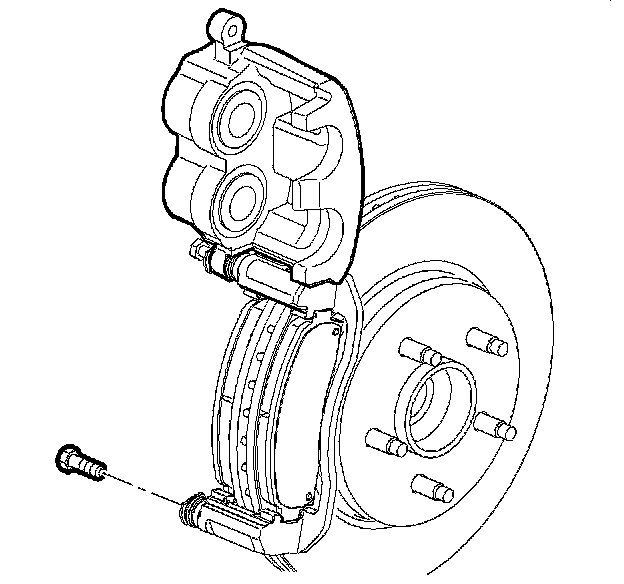 11. Notice: Support the brake caliper with heavy mechanic's wire, or equivalent, whenever it is separated from its mount and the hydraulic flexible brake hose is still connected. Failure to support the caliper in this manner will cause the flexible brake hose to bear the weight of the caliper, which may cause damage to the brake hose and in turn may cause a brake fluid leak.