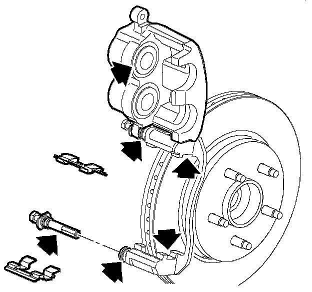 13. Remove the brake pad retainers from the caliper bracket.