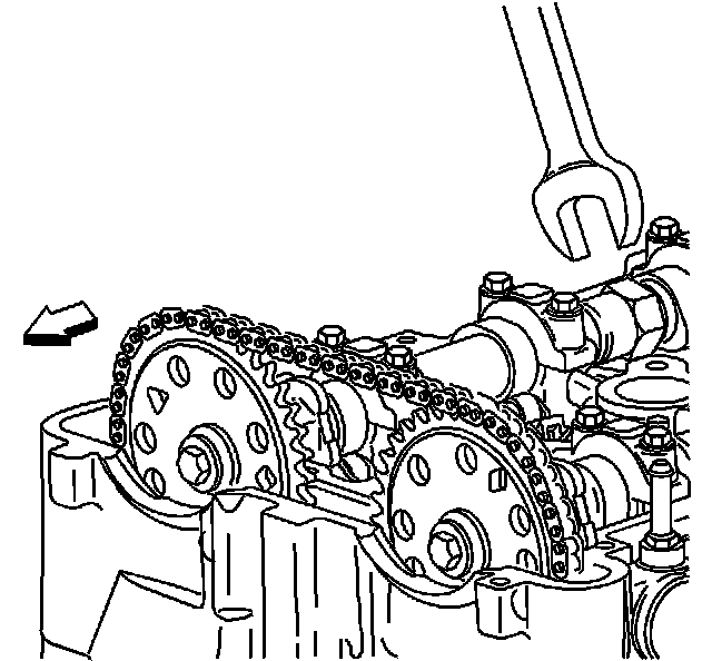 Using a 24 mm wrench, first turn the intake camshaft until the alignment feature on the back of the camshaft sprocket seats in the notch in the front of the intake camshaft.