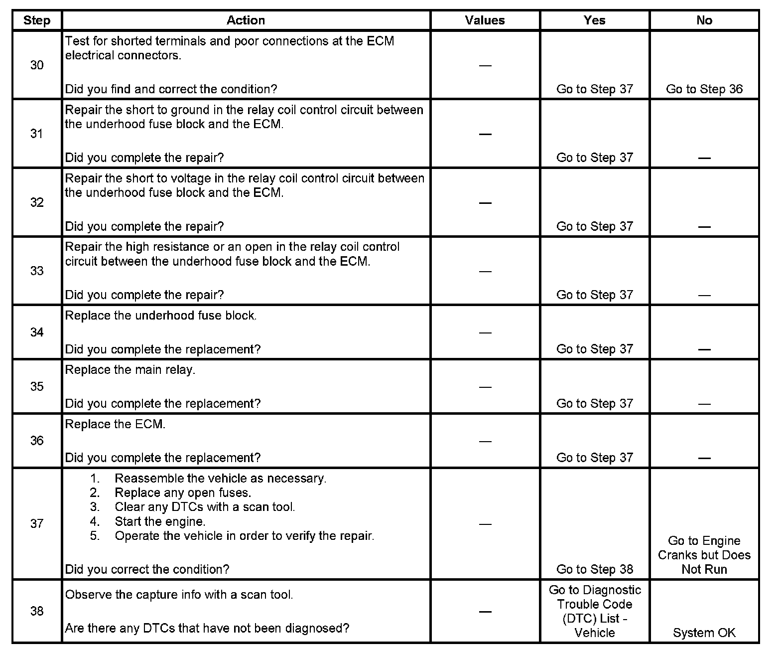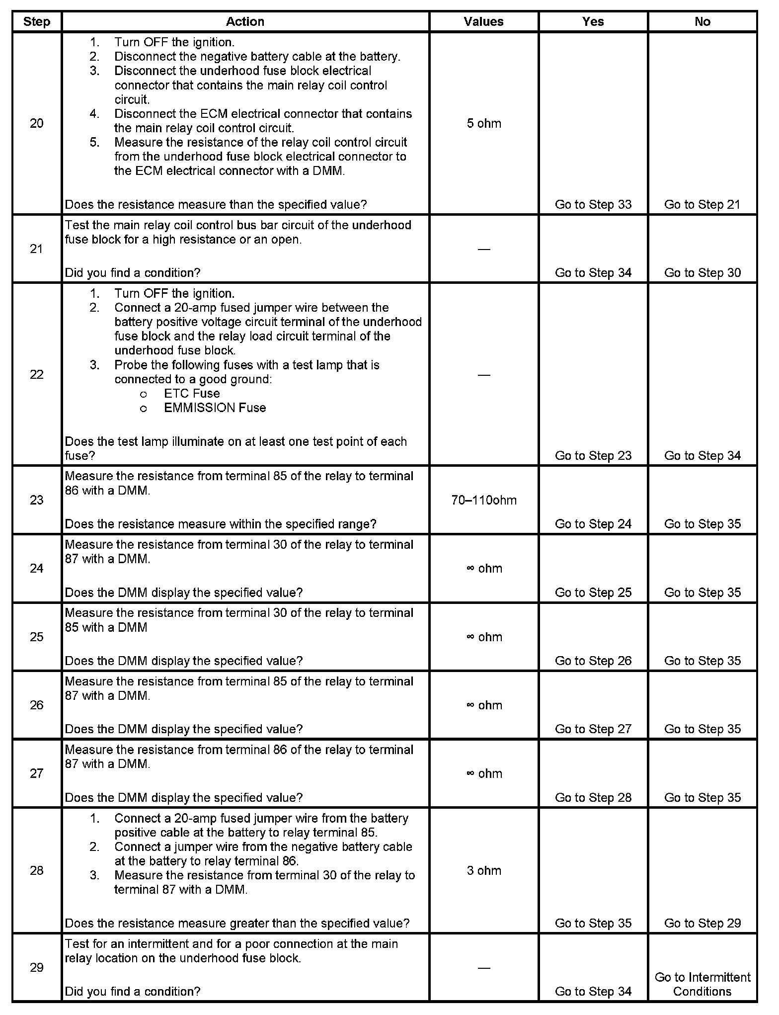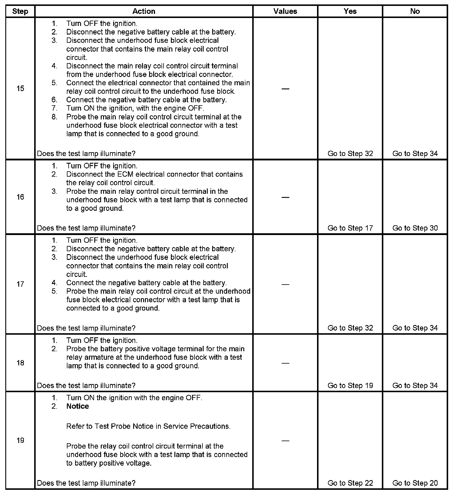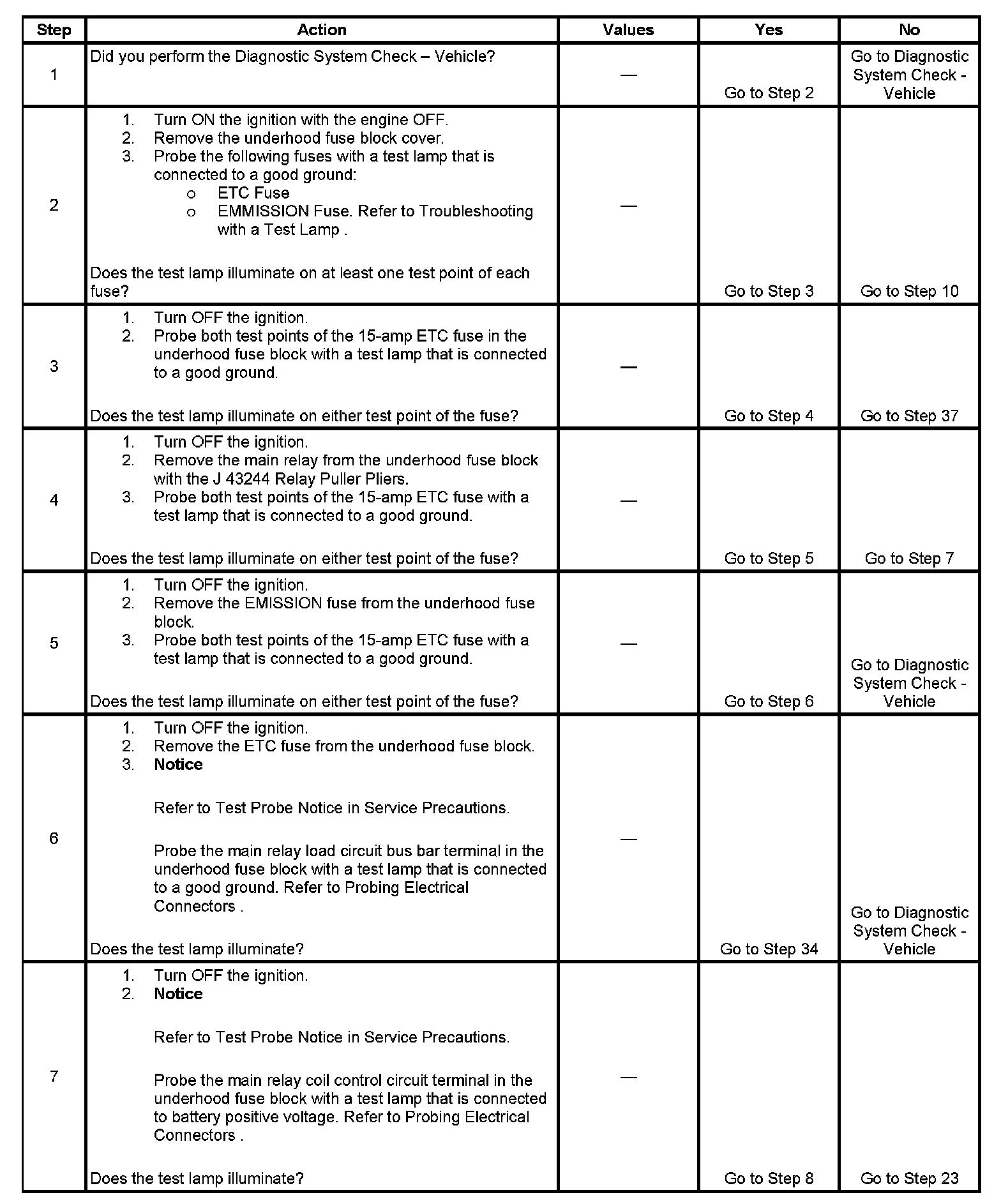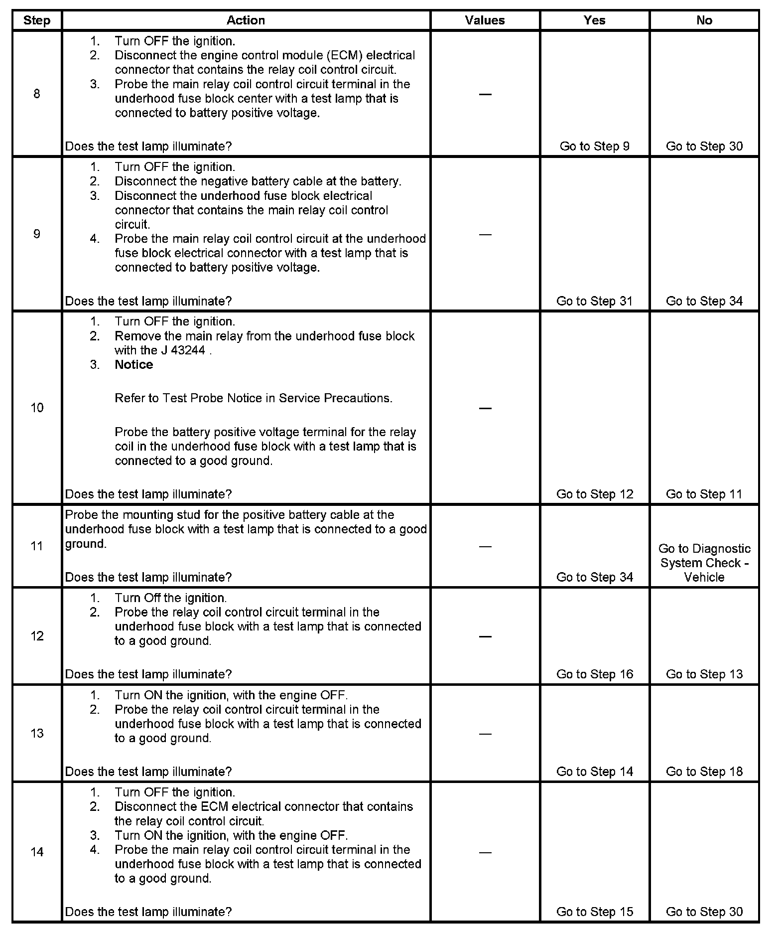 The main relay system diagnosis table assumes that the vehicle battery is fully charged. Refer to Battery Inspection/Test (Side Terminal Battery) Battery Inspection/Test (Top Post Terminal Battery).