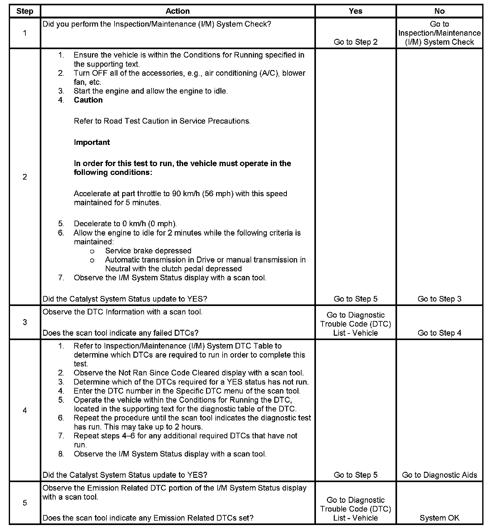 The purpose of this test is to satisfy the enable criteria necessary to execute inspection/maintenance (I/M) readiness diagnostics for the catalyst system. The test may be used to set the I/M System Status indicators to YES. The I/M System Status Display on the scan tool provides an indication of whether the control module has completed the required tests. I/M System Status does not indicate that the tests have passed or failed. When all of the diagnostics for a specific system have run and passed I/M System Status will update to YES. If a test for a specific system has failed, the I/M System Status will update to YES, indicating a determination was made, even if all of the other tests for that system have not run.