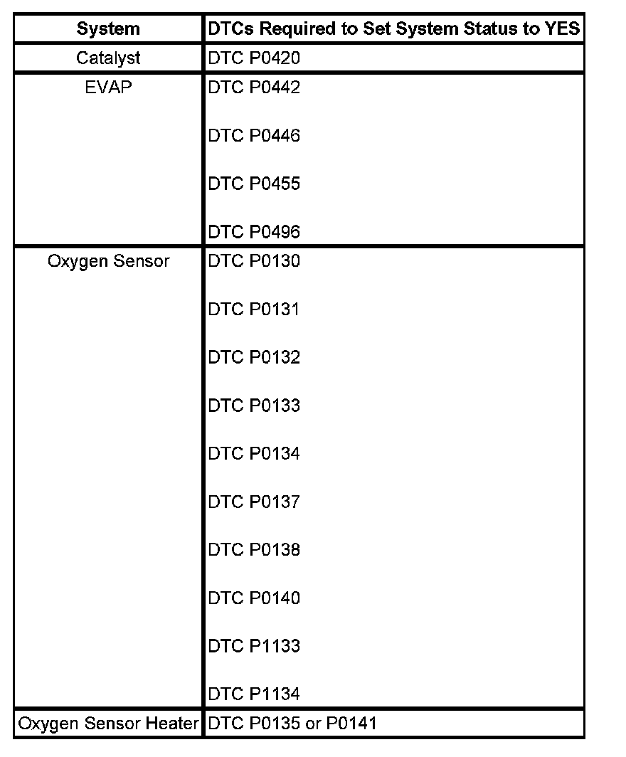 Inspection/Maintenance (I/M) System DTC Table: