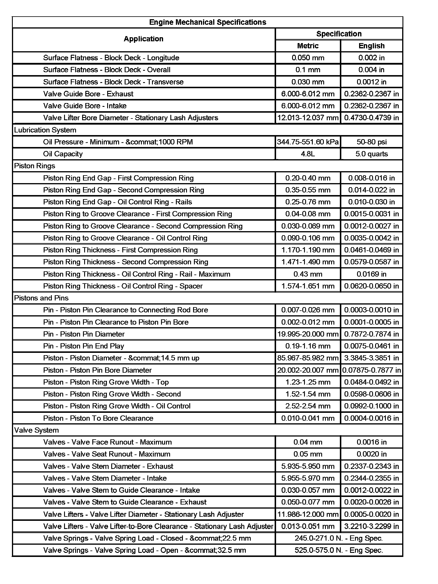 Engine Mechanical Specifications