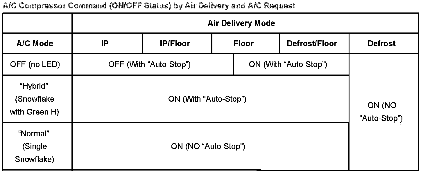 This table also shows that when the A/C mode is OFF (no LED), the A/C compressor will still be commanded ON anytime the air delivery is to the floor or rotated clockwise from "floor." This is to minimize window fogging. For an owner who wishes to maximize their fuel economy, selecting "one click back," or more, from "floor" will disable the compressor.
