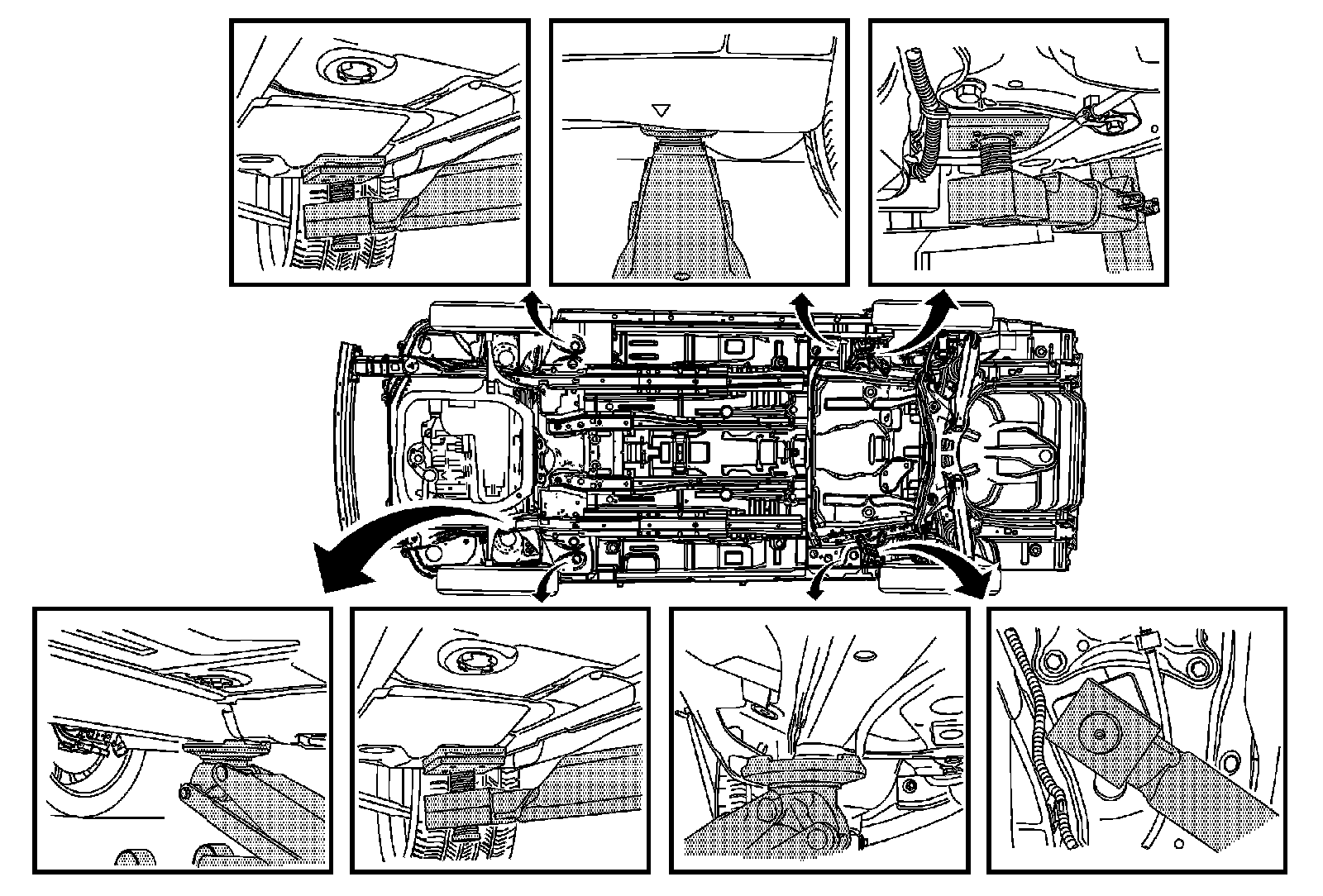 Notice: When you are jacking the vehicle at the front locations, be certain that the jack or the jack lift pad does not contact the front fascia, front fascia air dam, or the front fenders. If such contact occurs, vehicle damage may result. When jacking at selected front locations additional clearance may be required for the jacking points.