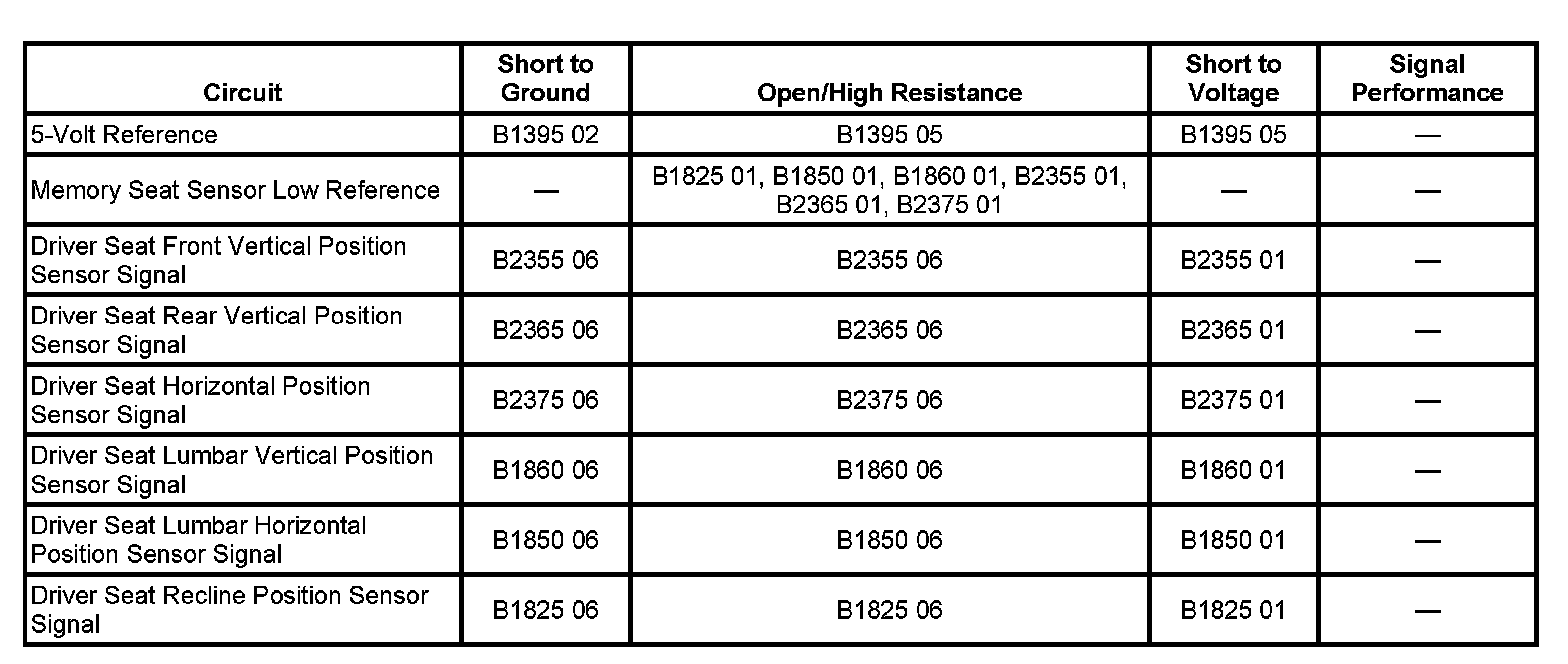 - If greater than 5.15 volts, test the 5-volt reference circuit to all position sensors or a short to voltage. If the circuit tests normal, replace the memory seat module.