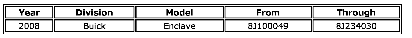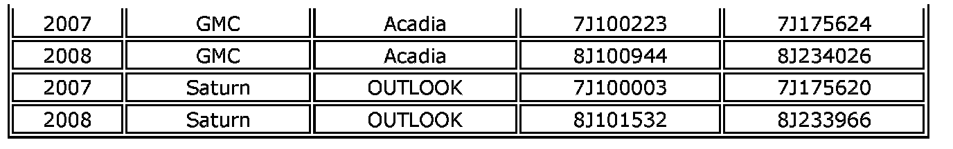 Involved are certain 2008 model year Buick Enclave and 2007-2008 model year GMC Acadia and Saturn Outlook vehicles that are located outside of Alaska, Colorado, Connecticut, Delaware, District of Columbia, Idaho, Illinois, Indiana, Iowa, Maine, Maryland, Massachusetts, Michigan, Minnesota, Montana, Nebraska, New Hampshire, New Jersey, New York, North Dakota, Ohio, Pennsylvania, Rhode Island, South Dakota, Utah, Vermont, West Virginia, Wisconsin, or Wyoming and built within the VIN breakpoints shown above.
