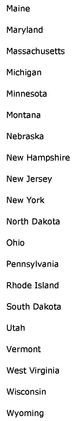 Currently or Previously Registered in Canada, Alaska, Colorado, Connecticut, Delaware, District of Columbia, Idaho, Illinois, Indiana, Iowa, Maine, Maryland, Massachusetts, Michigan, Minnesota, Montana, Nebraska, New Hampshire, New Jersey, New York, North Dakota, Ohio, Pennsylvania, Rhode Island, South Dakota, Utah, Vermont, West Virginia, Wisconsin, and Wyoming
