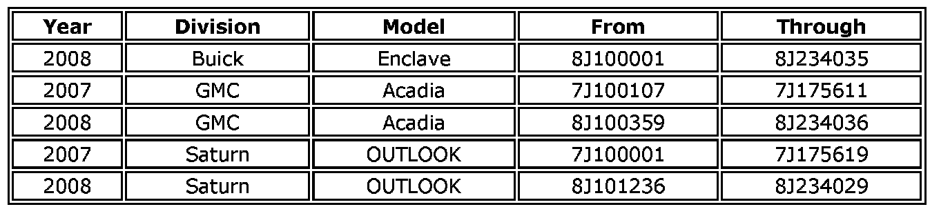 Involved are certain 2008 model year Buick Enclave and 2007-2008 model year GMC Acadia and Saturn Outlook vehicles that are located outside of Alaska, Colorado, Connecticut, Delaware, District of Columbia, Idaho, Illinois, Indiana, Iowa, Maine, Maryland, Massachusetts, Michigan, Minnesota, Montana, Nebraska, New Hampshire, New Jersey, New York, North Dakota, Ohio, Pennsylvania, Rhode Island, South Dakota, Utah, Vermont, West Virginia, Wisconsin, or Wyoming and built within the VIN breakpoints above.