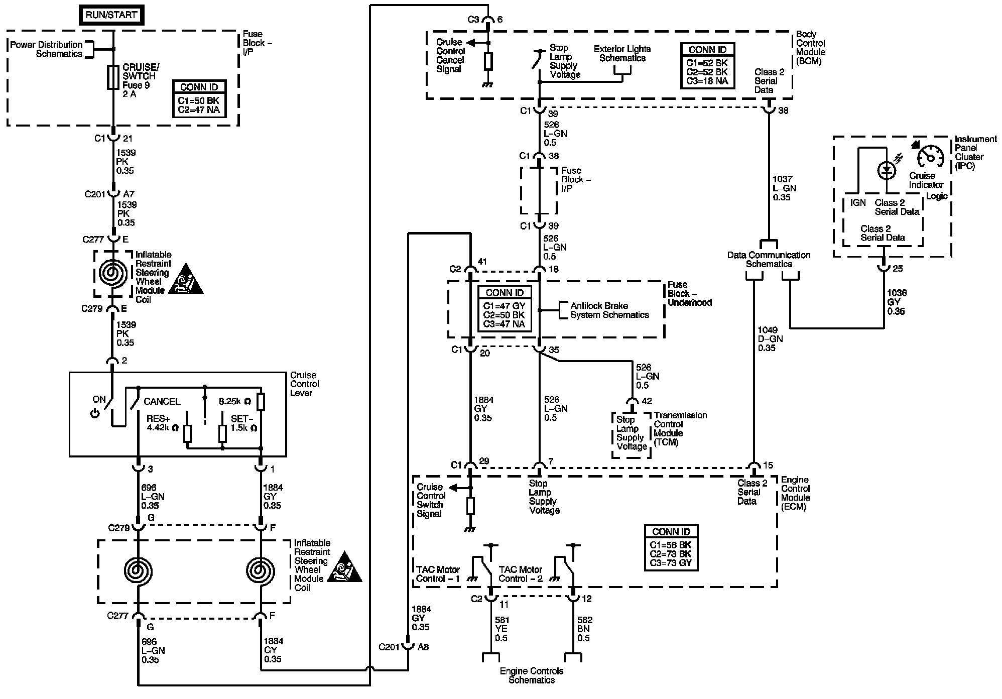 Cruise Control SchematicsLocation: The locations for the Connectors, Grounds, Splices, and Grommets shown within these diagrams can be found via their numbers at Vehicle Locations.