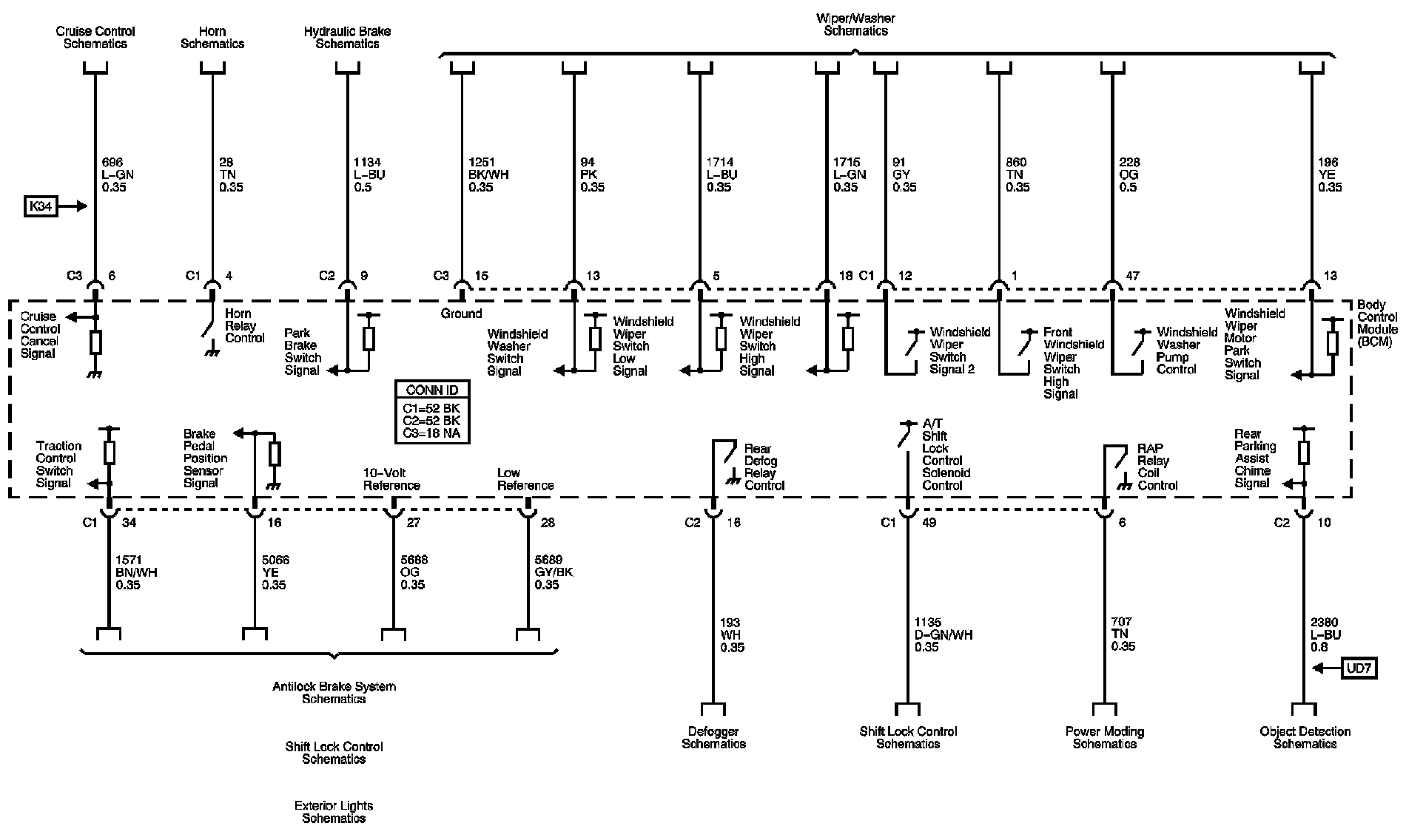 References to Brakes, Cruise Control, Defogger, Exterior Lights, Horn, Object Detection, Power Moding, Shift Lock Control, and Wiper/Washer