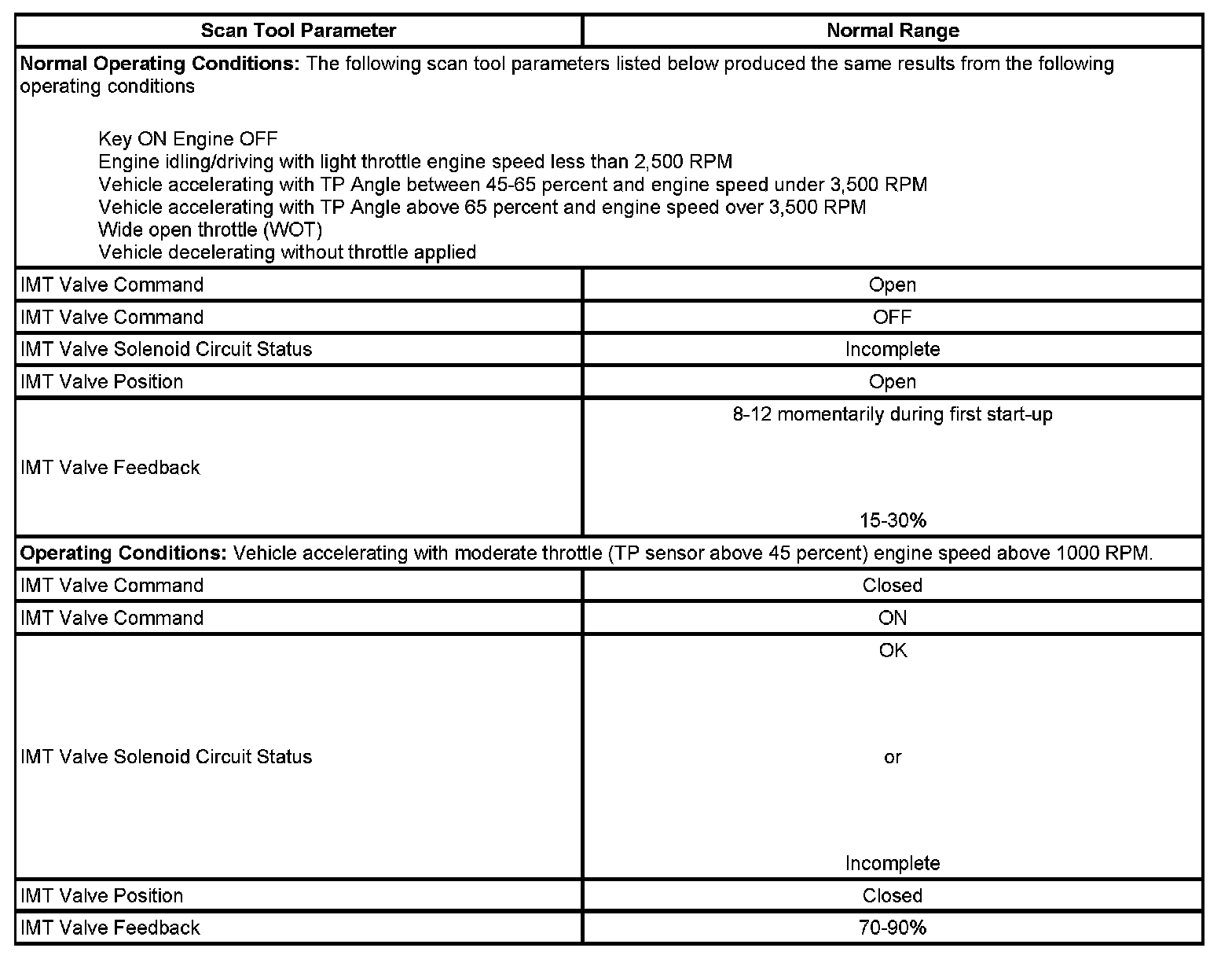 The intake manifold tuning (IMT) valve system uses variable air induction tuning in order to achieve maximum performance and efficiency over the entire operating range of the engine. The characteristic torque curve of a normally aspirated engine depends mainly on how the engines average pressure changes over the engine speed range. The average pressure is proportional to the volume of the air mass present in the cylinder when the inlet valve is closed. The design of the inlet system determines how large an air mass can be drawn into a cylinder at a given engine speed. An IMT valve is used to change the intake manifold plenum configuration. When the IMT valve is open, the intake manifold is configured to one large plenum. When the IMT valve is closed, the intake manifold is configured to 2 smaller plenums. The 2 intake manifold plenum sizes result in different torque curves, which improves performance at low and high engine speeds. During low speed, high load conditions the IMT valve is closed creating a longer runner path inside the plenum, which increases torque. During higher engine speeds and loads, the IMT valve opens creating a shorter runner path inside the plenum, which increases horsepower.