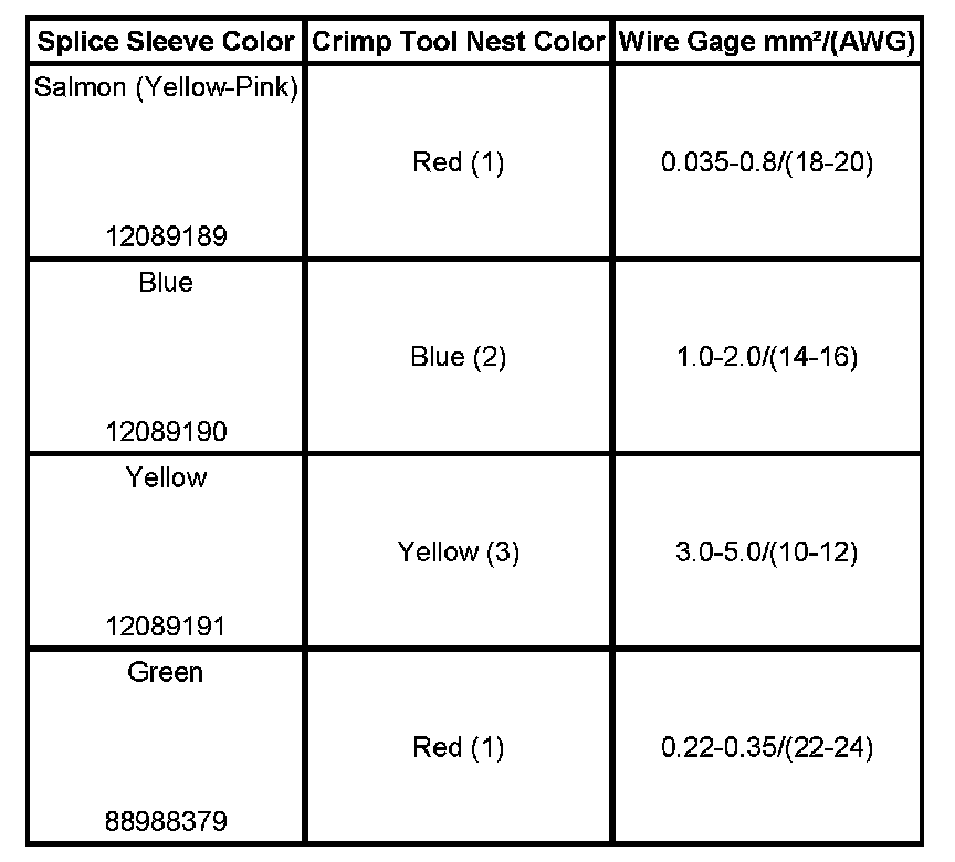 4. Select the proper DuraSeal splice sleeve according to the wire size. Refer to the above table at the beginning of the repair procedure for the color coding of the DuraSeal splice sleeves and the crimp tool nests.