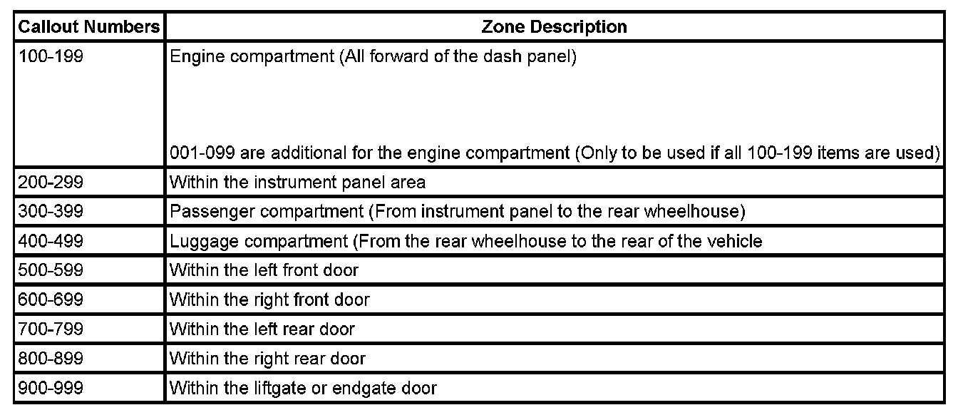 All grounds, in-line connectors, pass-through grommets, and splices have identifying numbers that correspond to where they are located in the vehicle. The table explains the numbering system.