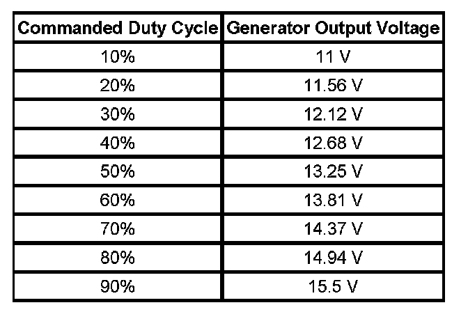 The engine control module (ECM) controls the generator through the generator field control circuit. It monitors the generator performance through the generator field duty cycle signal circuit. The signal is a pulse width modulated (PWM) signal of 128 Hz with a duty cycle of 0-100 percent. Normal duty cycle is between 5-95 percent. Between 0-5 percent and 95-100 percent are for diagnostic purposes. The following table shows the commanded duty cycle and output voltage of the generator: