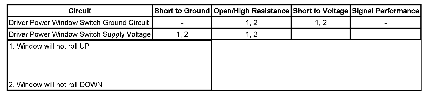 • If the driver window fails to roll down or up, refer to Power Windows Inoperative - One or Both Front Windows. Power Windows Inoperative - One or Both Front Windows