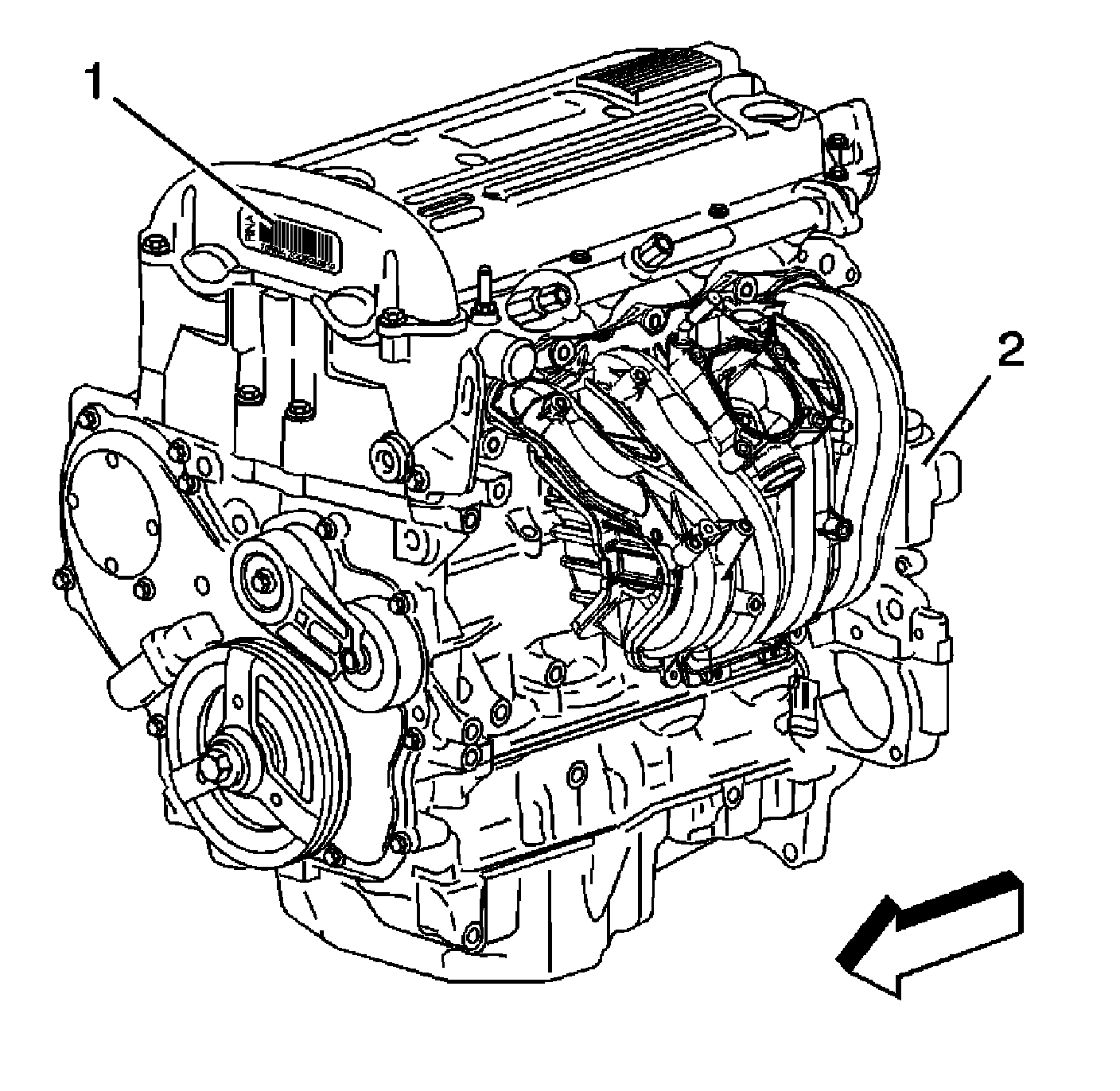 Identification can be made through the use of the Broadcast Code label on the engine front cover (1) and the use of the partial VIN etched on the oil filter bowl (2).