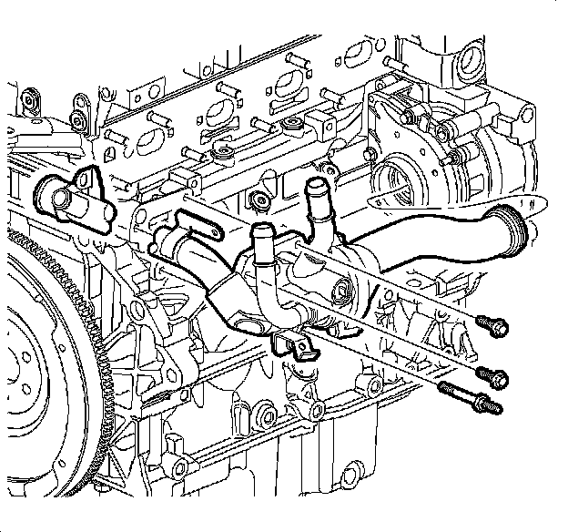 2. Remove the thermostat housing pipe-to-cylinder bolt near the front of the engine.