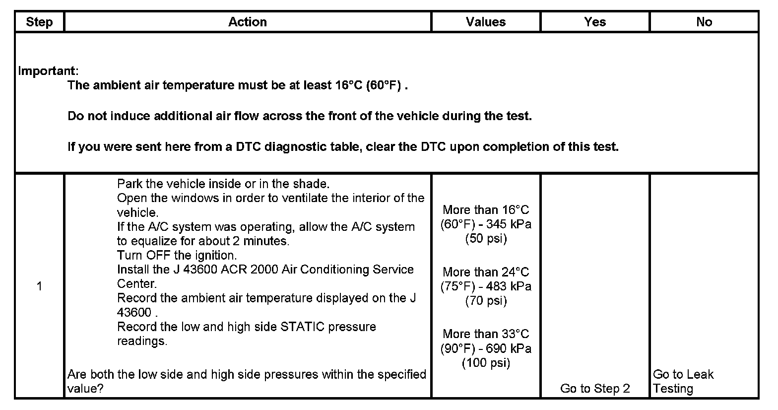 1. This step determines if the A/C system has at least the minimum refrigerant charge required to operate the system without damage.