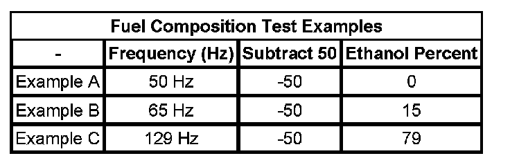 3. Subtract 50 from the reading on the DMM in order to obtain the percentage of alcohol in the fuel sample. Refer to the examples in the Fuel Composition Test Examples table.