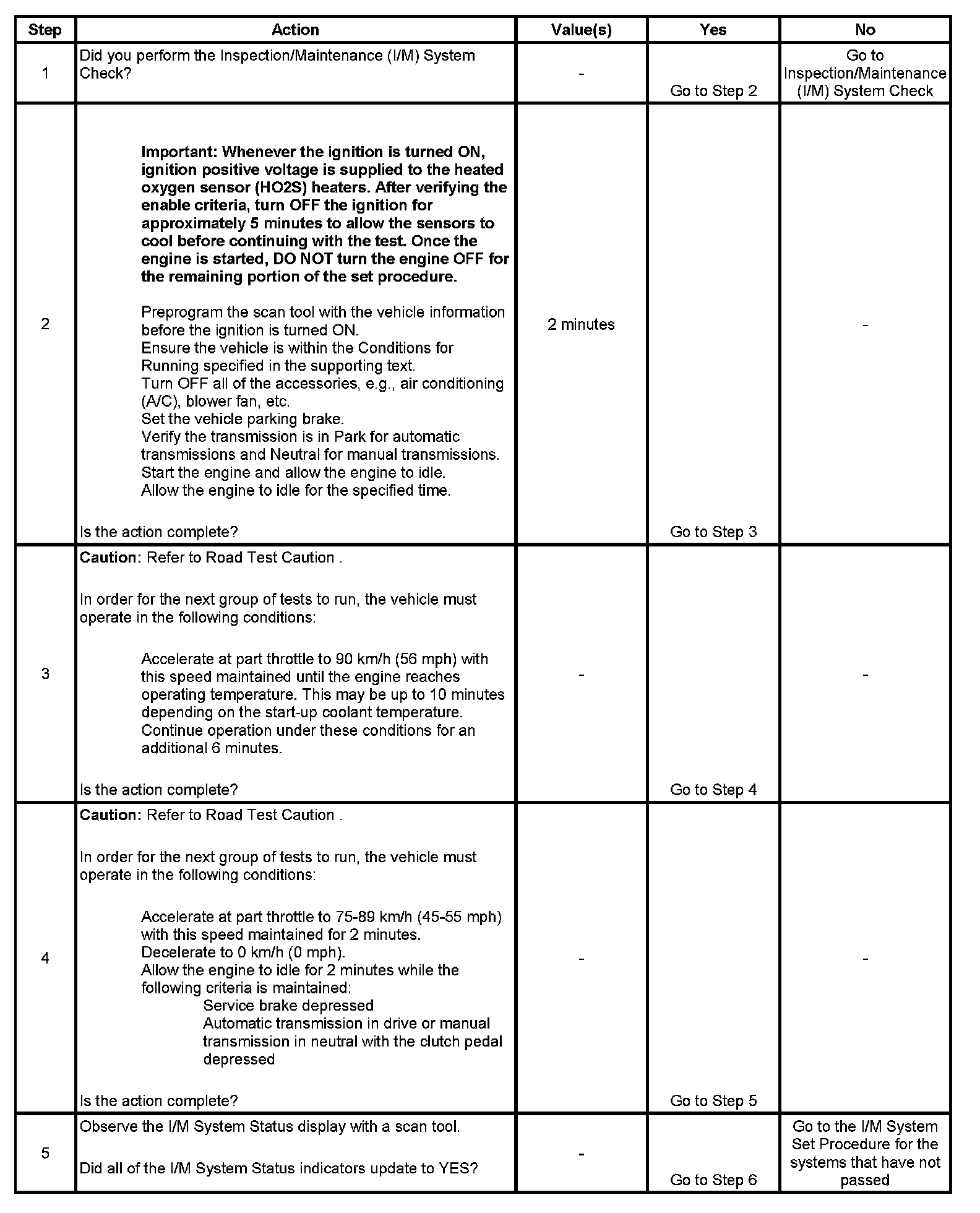 The purpose of the inspection/maintenance (I/M) Complete System Set Procedure is to satisfy the enable criteria necessary to execute all of the I/M readiness diagnostics, and complete the trips for those particular diagnostics. When all diagnostic tests are completed, the I/M System Status indicators are set to YES. Perform this procedure when more than one of the I/M System Status indicators are set to NO.