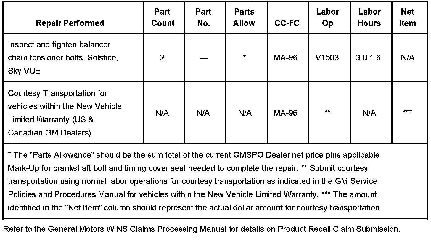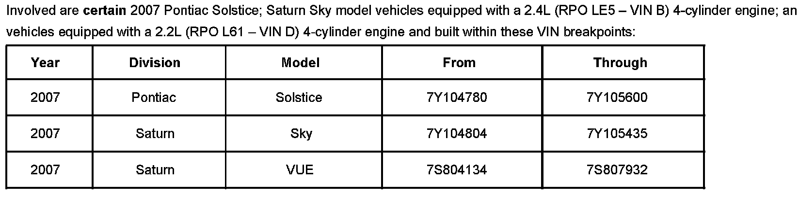 Certain 2007 Pontiac Solstice; Saturn Sky model vehicles, equipped with a 2.4L (RPO LE5 - VIN B) 4-cylinder engine; and Saturn Vue model vehicles, equipped with a 2.2L (RPO L61 - VIN D) 4-cylinder engine, may have a condition in which the upper bolt of the two bolts retaining the engine balancer chain tensioner was not torqued to specification. If the bolt falls out or the tensioner loosens sufficiently, damage to the balancer or camshaft drive systems, or engine could occur.