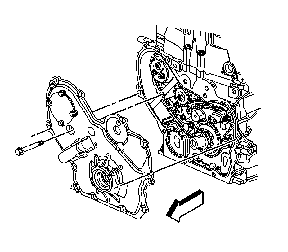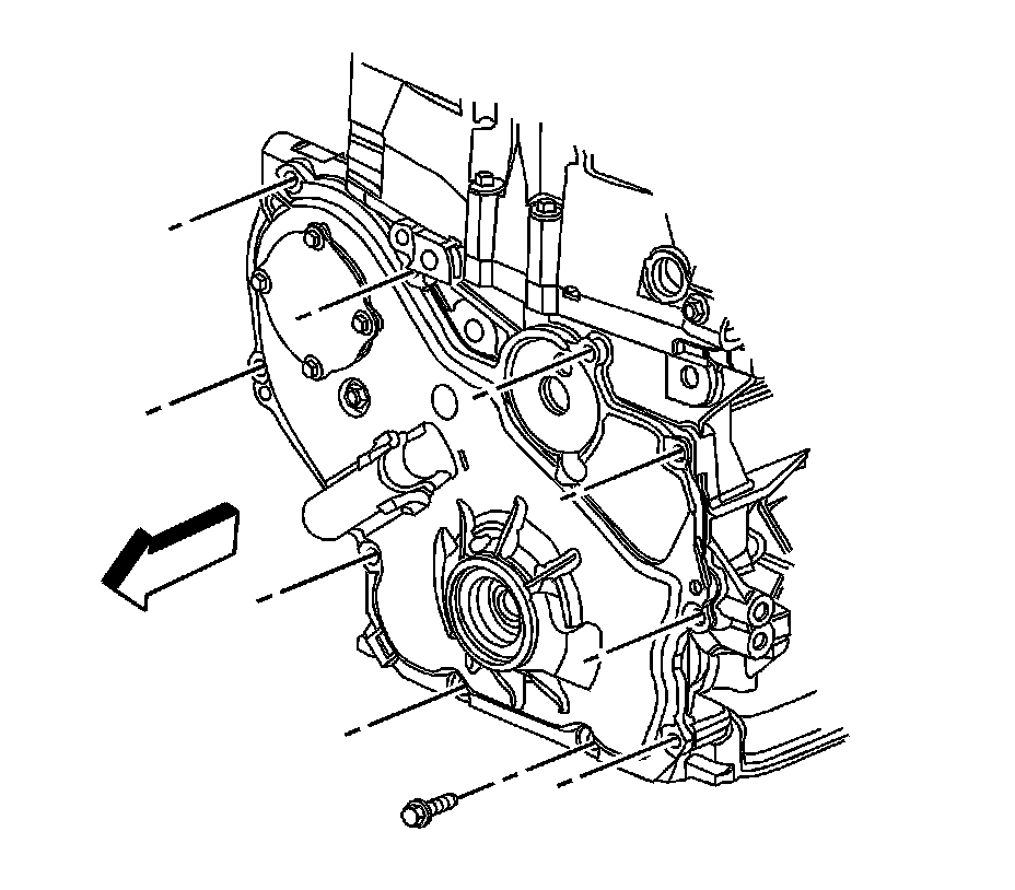 9. Remove the engine front cover to water pump bolt.