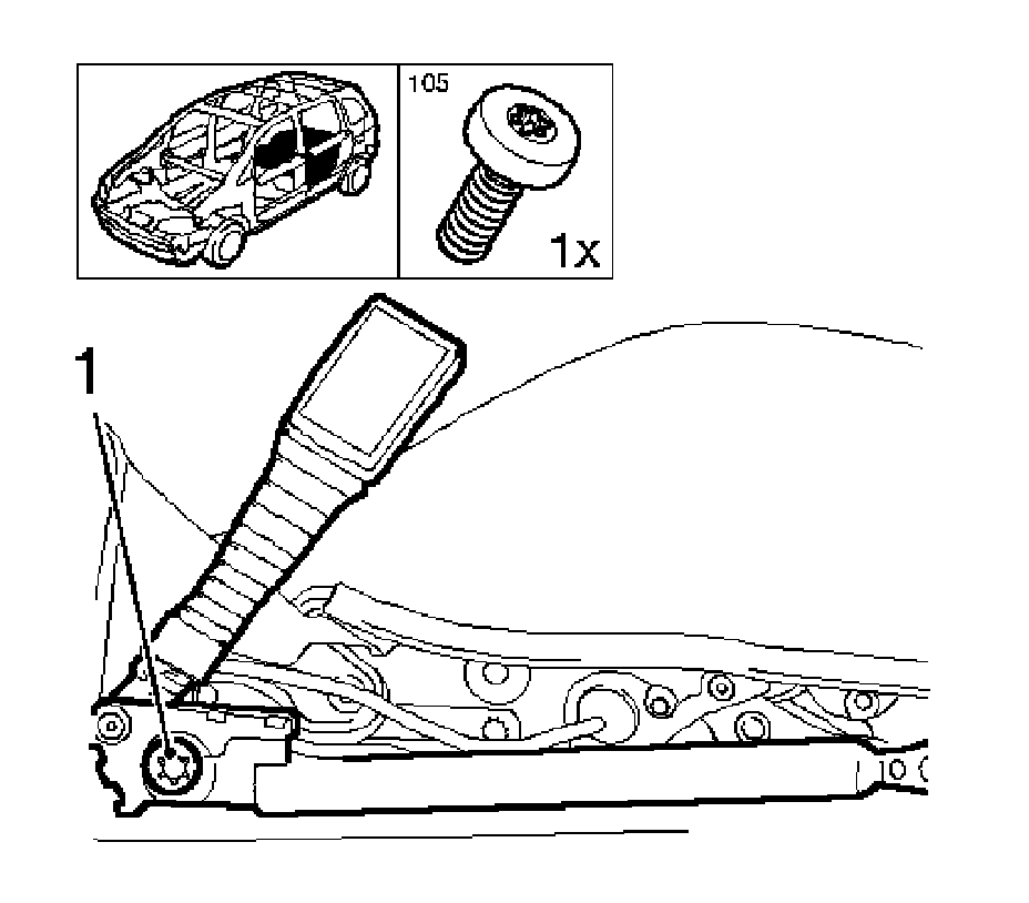17. Remove the bolt (1) and remove belt buckle tensioner from the bracket.