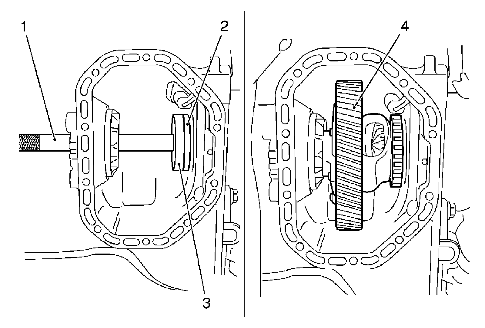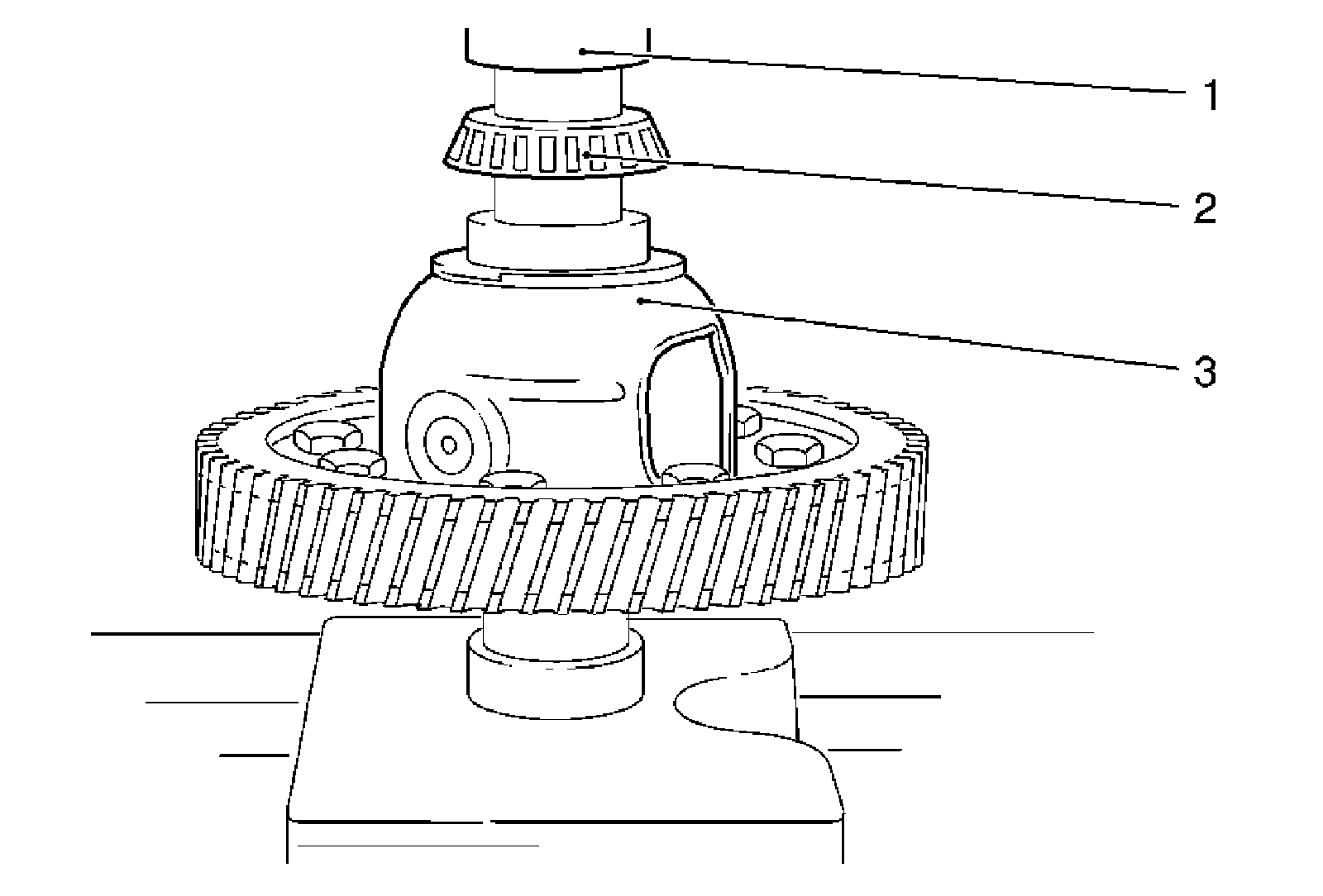 Attach tapered roller bearing inner race with KM-453 (1) to differential housing (3).