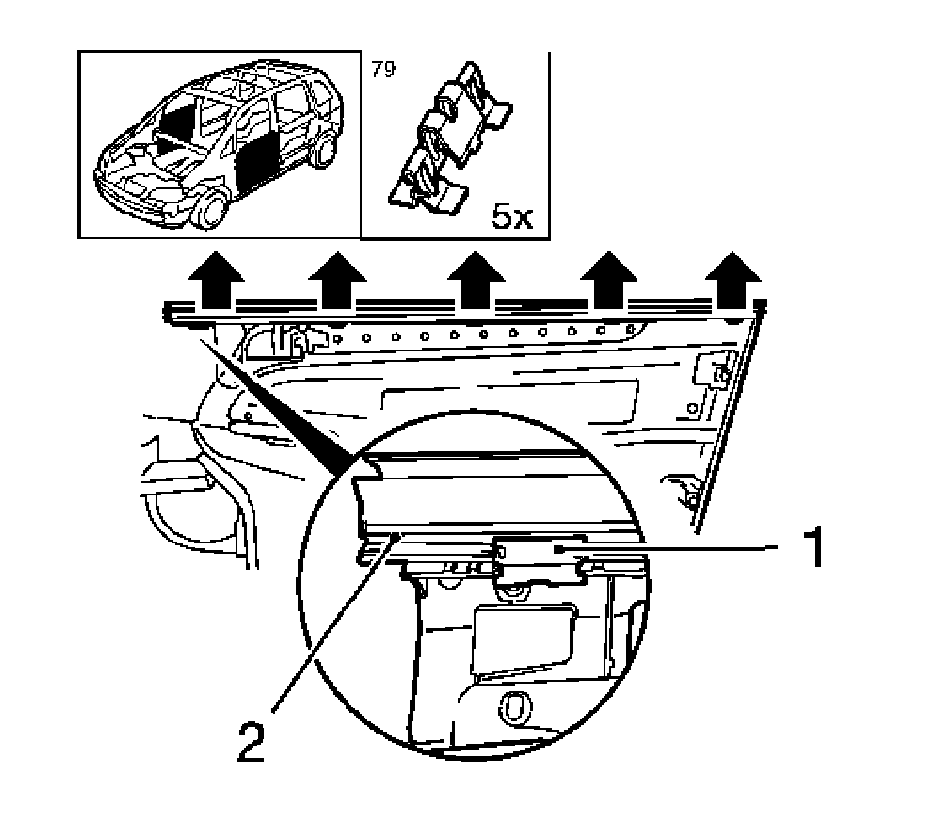2. Remove the window belt inner sealing strip on inside of front door (2).