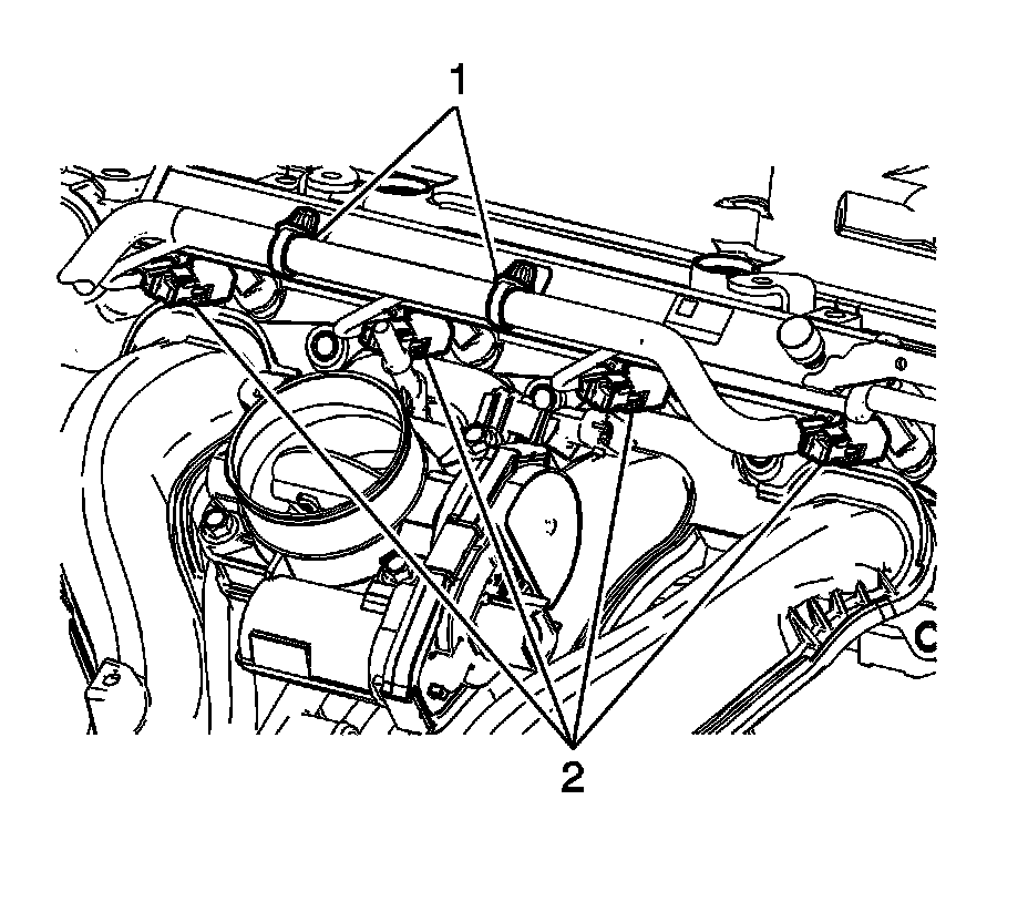 5. Remove the fuel injector wiring harness clips (1) from the fuel rail tabs.