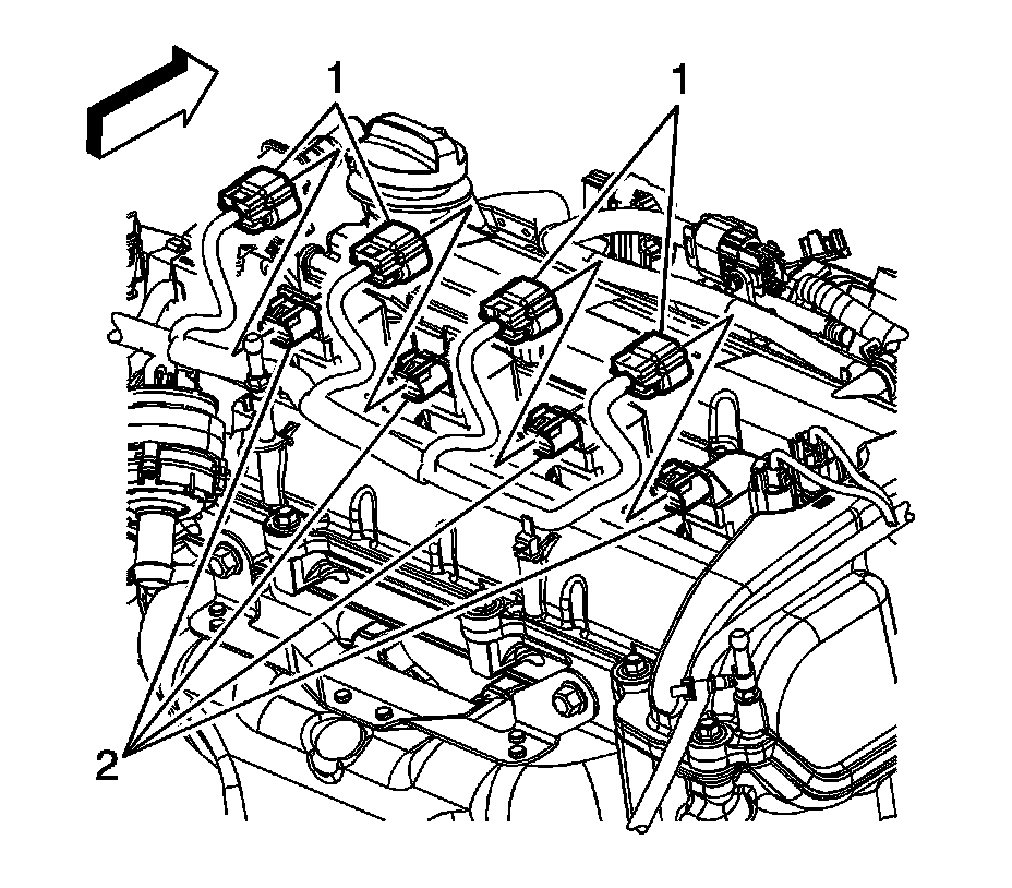 2. Disconnect the engine wiring harness electrical connectors (1) from the ignition coil(s) (2).