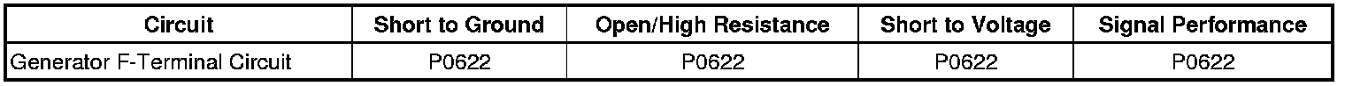 The engine control module (ECM) uses the generator field duty cycle signal circuit to monitor the duty cycle of the generator. The generator field duty cycle signal circuit connects to high side of the field windings in the generator. A pulse width modulated (PWM) high side driver in the voltage regulator turns the field windings ON and OFF. The ECM uses the PWM signal input to determine the generator load on the engine. This allows the ECM to adjust the idle speed to compensate for high electrical loads. The ECM monitors the status of the generator field duty cycle signal circuit. When the key is in the RUN position and the engine is OFF, the ECM should detect a duty cycle near 0 percent. However, when the engine is running, the duty cycle should be between 5-95 percent.
