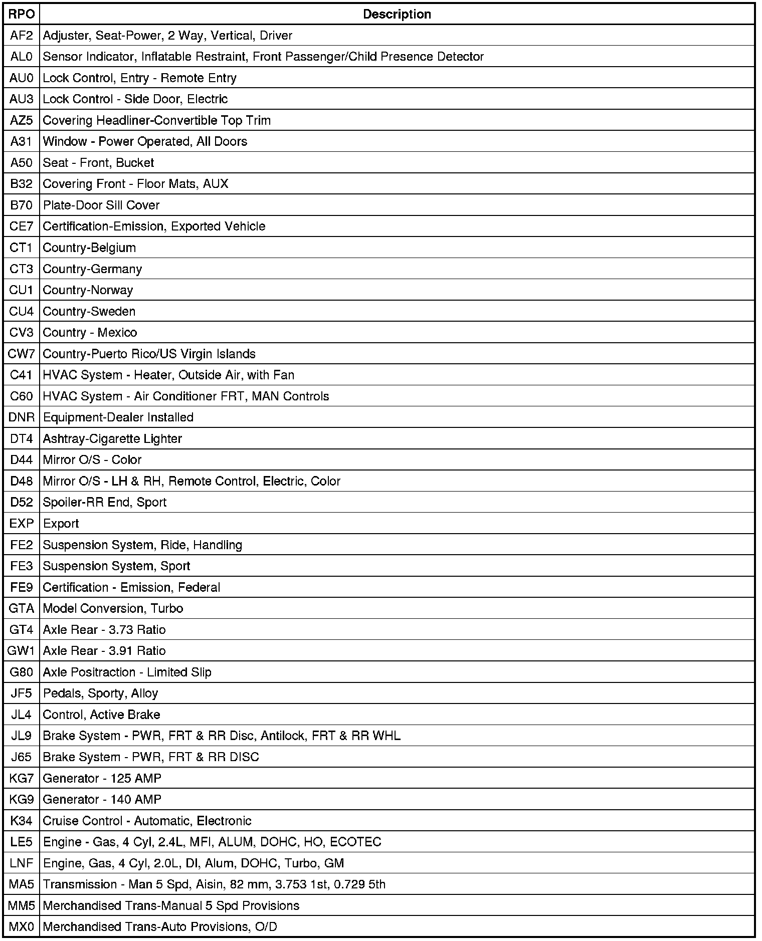 The following table provides the description of the Regular Production Option (RPO) codes that are available on the vehicle. The vehicle RPO list is printed on the Service Parts Identification Label.