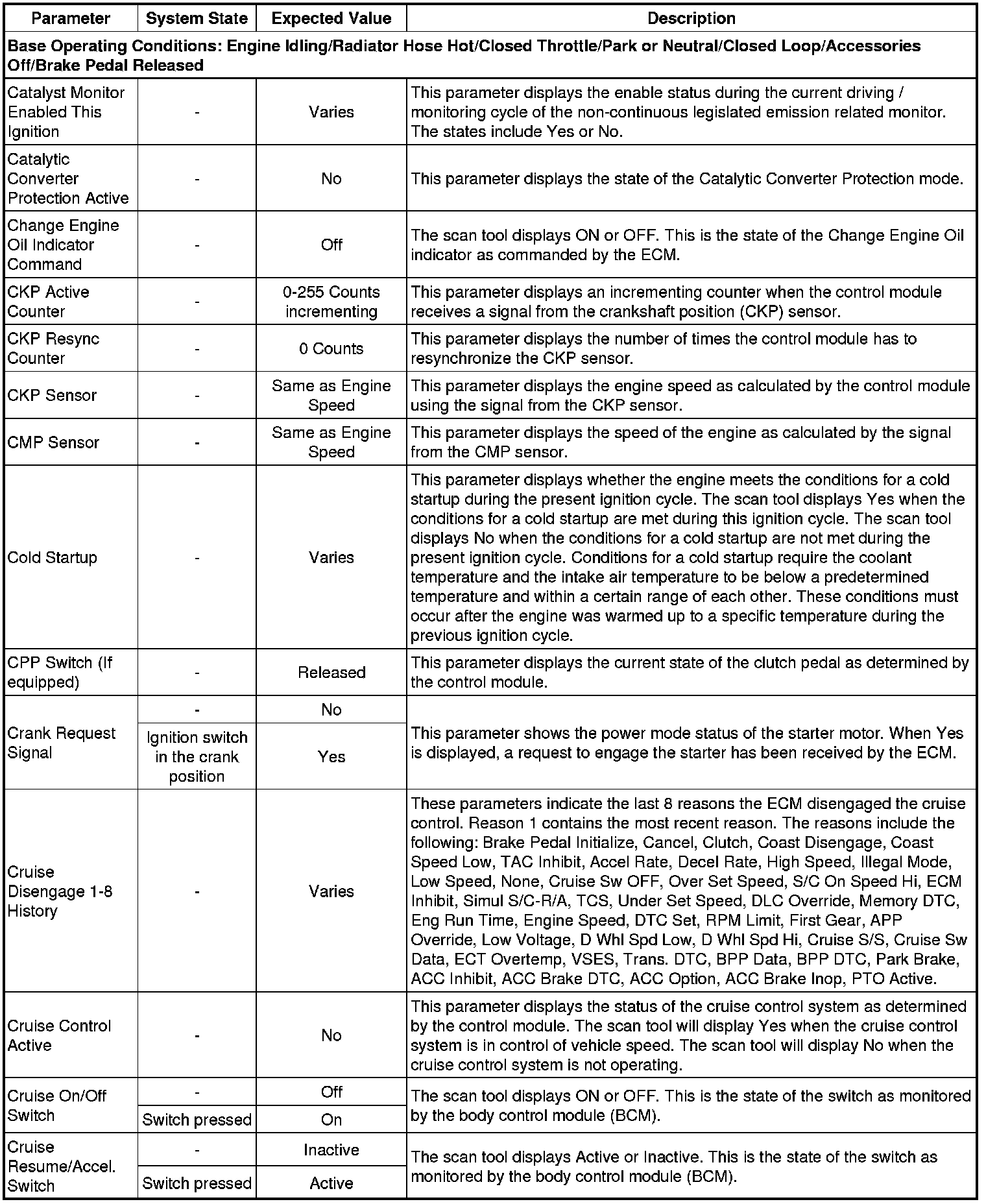Only the parameters listed below are referenced in this service manual for use in diagnosis. If all values are within the typical range described below, refer to Symptoms - Engine Controls (- Symptoms - Engine Controls) for the 2.4L engine for diagnosis.