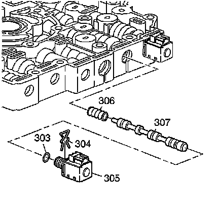 5. Remove the 2-3 shift solenoid retainer clip (304), the 2-3 shift solenoid (305) with O-ring (303), the 2-3 shift valve (307), and the 2-3 shift valve spring (306).