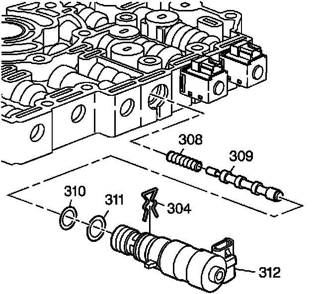 4. Remove the Pressure Control Solenoid (PCS) retainer clip (304), the PCS with two O-rings and screen (312, 309, 310), the torque signal regulator valve (309), and the torque signal regulator spring (308).