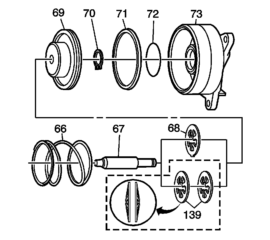 4. Assemble the servo piston assembly (67-70) into the servo cover (73). Lubricate the piston seals with transmission fluid in order to aid in assembly.